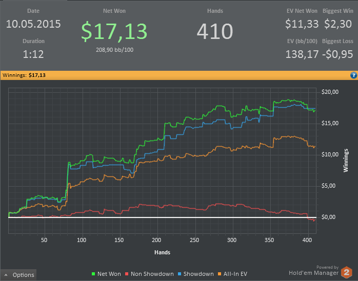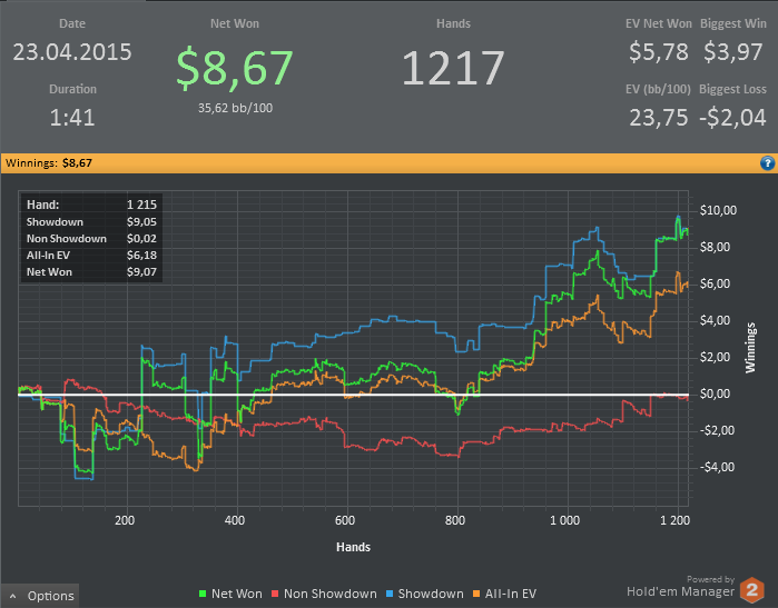 Вторая минисессия тоже прошла хорошо. Много перебрал по EV, выигрывал тройные олл-ины с сетом против врапов и тд. Уже за столами попадаются по 1-2 игрока с цветовыми метками, что настораживает))