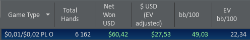 Пока такая картина получается. Банкролл - 109.7 Если все будет хорошо и стрик не сменит вектор, то уже надо задумываться, при каком уровне банкролла переходить на PL5. Изначально думал, что на 30 бай-инах, но впринципе для шести столов можно задуматься о том, чтобы при 25 бай-инах 5 играть два стола PL5 и четыре - PL2. Если у кого-то есть опыт/дельный совет по БМ при подъеме с низов в омаху, буду рад услышать