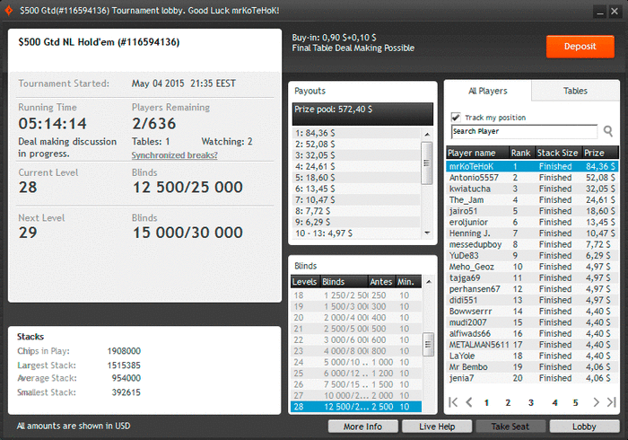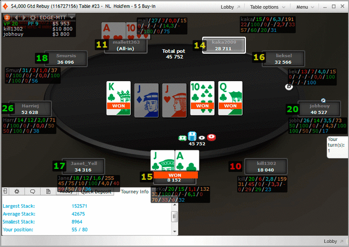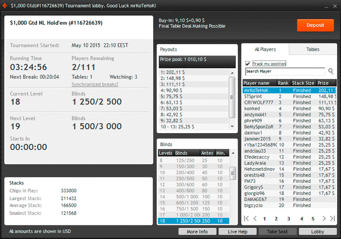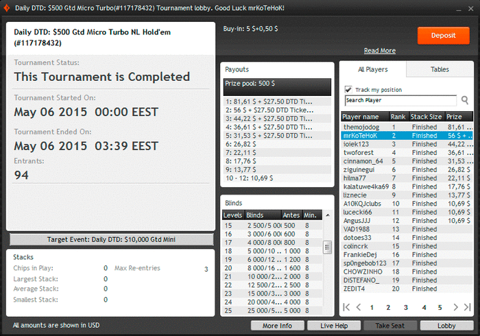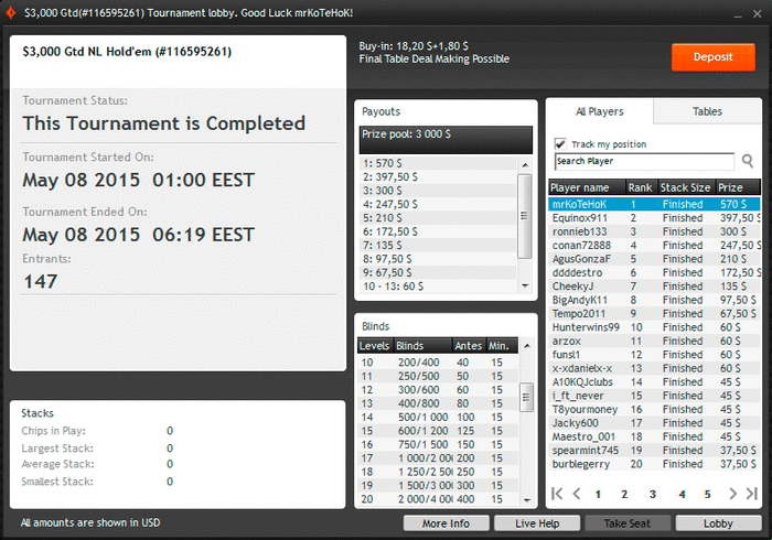 Party, $4.55 Buy-in (100/200 blinds, 20 ante) No Limit Hold'em Tournament, 9 Players