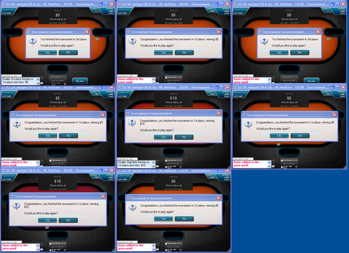 Вчера закинув 10 долларов я сначала поднял до 15, потом попал на 25$ и выиграл, потом играл играл меня постоянно перезжали вообщем тильтанул начал регать по 5$ сыграл в +5$ и стало 25, потом сыграл в -5 было 20, решил пойти покурить, пошел покурить пришел вообще расслабленный, прокленал покер, зарегал 4 стола по 5$ выпали призы 10 - 10 - 10 - 50