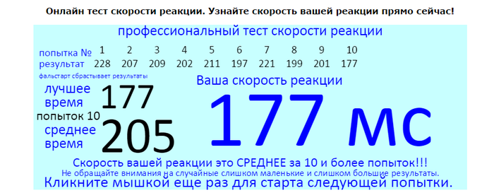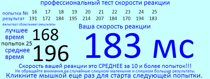 Ничем профессионально не занимался. Фальстарт не делаю, хуже всего получается, когда тест срабатывает почти без паузы, не ожидаю этого и получается в районе 240-260.