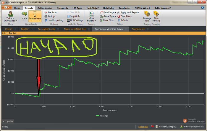 Единственный тренер у которого брал несколько тренировок. Очень помог мне на первых парах в МТТ, доходчиво объяснял, быстро понял суть моих основных проблем, приятный в общении хороший человек (что не мало важно). Думаю он не успел ещё всё рассказать, но человеческая натура такова, что: "начал плюсовать - зачем ещё тренировки", хотя думаю ещё потренируемся. Т.ч. дабы тренерский талант не пропал - всем советую! Мой график после начала тренировок: