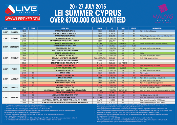 Команда Live Events International приглашает на солнечный Кипр, который в летний сезон становится настоящей покерной Меккой! Турниры на любой вкус и банкролл, а также невероятный action в кеш-играх от "эксклюзивных" игроков из Турции и Ливана!