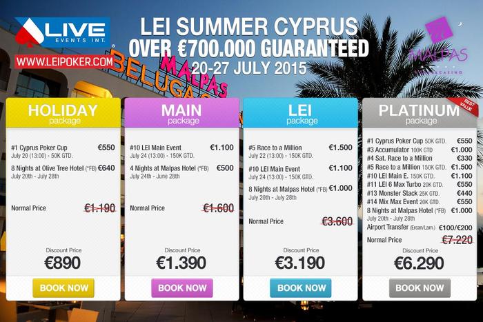 Пакеты #3 (LEI Package) и #4 (Platinum Package) включают в себя бай-ины на различные турниры, а также 8 ночей проживания в Malpas Hotel & Casino 5* со скидкой 60% для LEI Pacakge и 93% для Platinum Package (в пакет Platinum также включен бесплатный трансфер "аэропорт-отель-аэропорт" - Эркан или Ларнака).