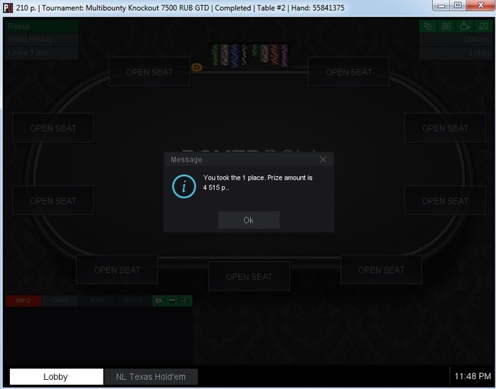 Сегодня получилась отличная сессия, выиграл knockout 10k в котором до сегодняшнего дня всё время не складывалось, второе место в freezeout 7,5k и несколько мини кэшей. БР вырос в 2 раза на что ушло две недели, цель достигнута. Итого БР 16,4к.