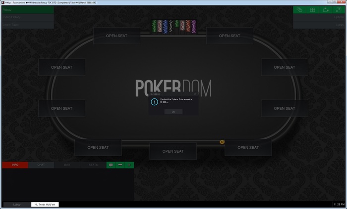 Есть несколько спорных раздач по итогам каждой сессии, жаль что PokerDom не поддерживает HM и их не разобрать/обсудить, да и за результатами с его помощью следить стало бы намного легче. Сегодня получилась хорошая сессия, но к сожалению только 2 место в 6 - max турнире, где я проиграл раздачу AQ в A8 за 1 место. Итого БР 15,2к.