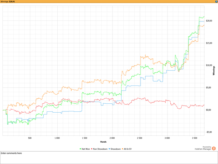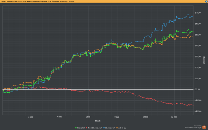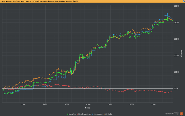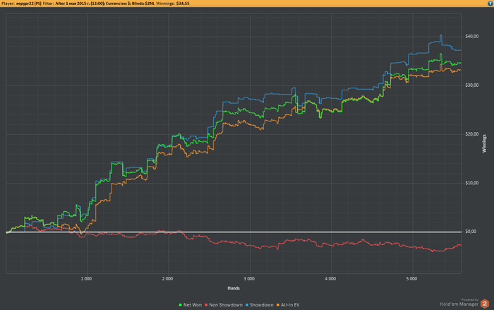 Пока NL2 бьется 21бб/100. Думаю, что ниже винрейт не опущу. 5 стеков точно отдал по глупости (все раздачи даже эти помню), а это было уже 25бб/100. Буду делать более основательные выводы после того как отыграю хотя бы 25к рук. Считаю что для этого лимита такой дистанции вполне достаточно, так как ребята с VPIP=90 просто не позволяют вам проигрывать деньги.
