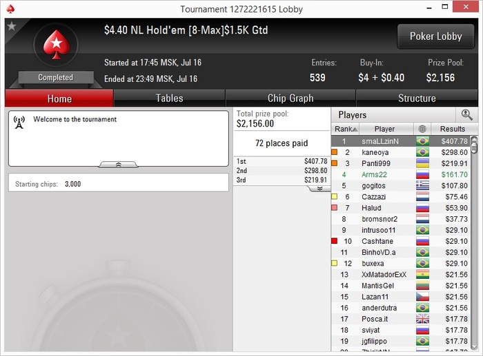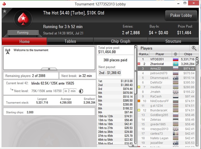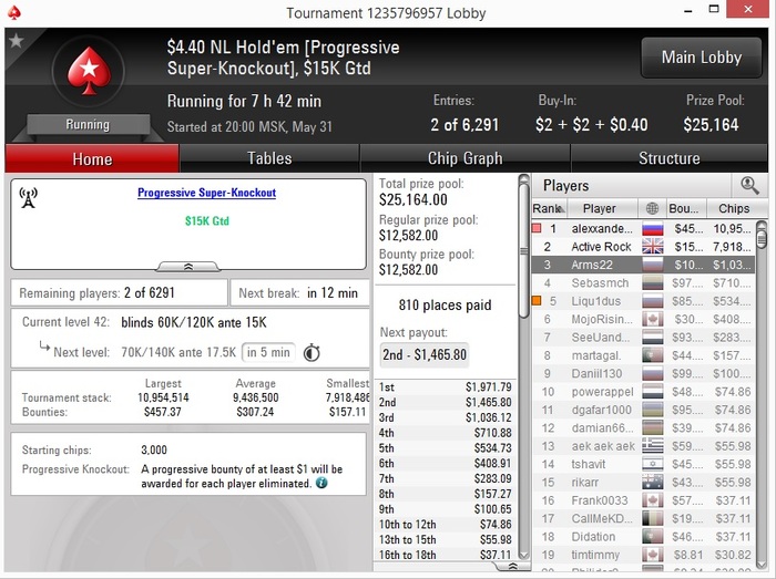 Решил перейти в СНГ, где наколотив ~1,5k$, я понял, что перспектив тут мало, и лучше идти в МТТ. Стартанул сразу с АБИ 5 (3-8$ катал), и всерьёз думал что бью это поле. Лишь после того, как залил 1k$, до меня дошло, что нужно кардинально что-то менять.