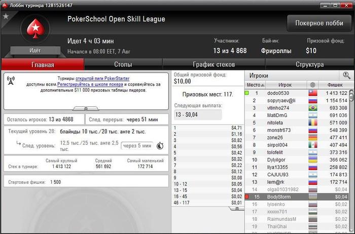 Наверное, таких игроков в онлайн покер, как я, очень много. И многие игроки идут по тому же пути, что и я. Для меня холдем был открыт менее года назад, и начинал я, естественно с фрироллов. Основная ошибка играющих на фрироллах - это несерьезность подхода к самой игре как таковой. Своих личных средств я не вложил, стало быть и проиграть те копейки, которые выиграл не жалко и нажимаешь ALL-IN с Q8 из UTG. Нет, так продолжаться не должно!!! Поскольку даже на фрироллы уходит очень много времени и вылететь не войдя в призы, но потратить на это 3 часа личного времени это глупо и бессмысленно (если не поменять свое отношение к игре, то тебе в покере нечего делать). Ошибок в моей игре еще очень много,но, если заниматься собой и работать над ошибками, результат обязательно будет (положительный). Ошибок в моей игре еще очень много, учитывая мой малый опыт игры, но я стараюсь с этим бороться. Если раньше мне было очень жалко скинуть стартовую руку с любым тузом, то сейчас я уже не задумываясь могу скинуть такие руки как АА, КК, АК, если ситуация того требует. Ну естественно, это все вода и такого рода статей уже написано большое множество. Недавно я проиграл весь выигранный мною банкролл, поэтому, чтобы дополнительно себя мотивировать я решил начать некий марафон по наполнению банкролла. Цель данного марафона будет заключаться в том, чтобы за месяц игры на фрироллах набить банкролл не менее 10 $. Играть я буду на PokerStars. Надеюсь, что это у меня получится. Ну а все желающие могут за этим понаблюдать. Я буду сообщать о своих успехах и неудачах и с удовольствием приму любую критику, замечания, комментарии и пожелания. Удачи мне)))