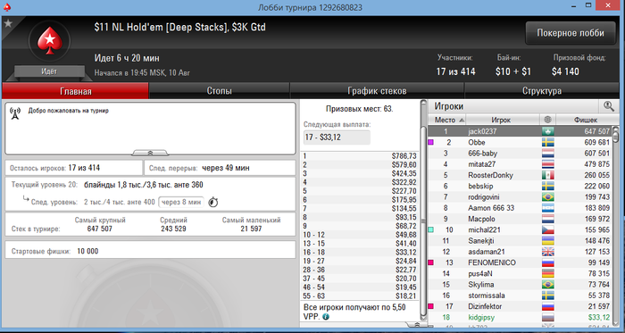 Все-таки дожали меня. Вообще турнир за 11$, но поле пиздец страшное. 18 оставалось каждый второй рег сидит.