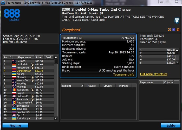 Всем привет. зовут меня Арс, мне 19лет (скоро 20), в покере уже 3-4года.. началось все у меня с условных фишек и фрироллов в покерстарс,, первый занос был дивизион3, 1место из 10к человек, если не ошибаюсь 20$ получил )) долгое время не играл на деньги.. после занос турнира на фтп для новичков 3место если не ошибаюсь, получил 240$.. перевел эти деньги на покерстарс и стал играть, как любой новенький в покере, фишово.. как-то поднял до 600$ и все слил за пару часов на больших лимитах hu гипер )) ладно,, продолжение уже думаю не имеет значения.. сразу перейду к марафону,, месяц назад сделал депозит в одном из крупных покерных румов мира, в 888покер депозит 30$+10$ добавили за первый деп.. за месяц сыграл всего около 100турниров, т.к. регулярно играл и на покерстарсе, с 16 до 26июля играл там турниры микромиллионс, где кстати стал 30им игроков из тысячи игроков: теперь решил полностью перейти на 888 и сделать большие деньги )) за это время успел пару разов попасть на финалки разных турниров и теперь бр у меня в 888 такой: это и будет начальный бр для марафона статистика pokerprolabs и график sharkscope до начала марафона: http://pokerprolabs.com/topsharkpro?pn=danbilzeryan&pnid=12&tt=mtt играть буду только мтт по бр имея минимум 50би, тоесть сейчас у меня 176, буду играть до 3$, ребайки до 2$. есть цель как можно быстро сделать 10к американских зеленых, потом еще больше. надеюсь до конца года уже дойду до 10к. это тема чисто для того, чтобы играл я аккуратно и по банкрол менеджменту )) отчет после каждого игрового дня.. есть возможность играть 10столов одновременно, играю с hm2.. если будут желающие посмотреть мою игру сделаю стрим с помощью микого или через скайп )) ник на 888: DanBilzeryan ,, аурный ник сделал удачи мне