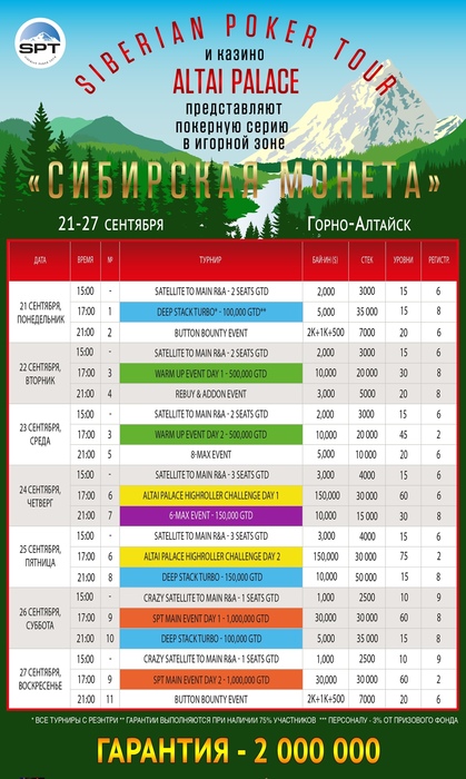 Всем любителям покера Сибири. Вас приветствует четвертый этап серии SPT, который перевернет ваши представления о живой игре. После трех первых этапов в апреле, июне и августемы полностью пересмотрели программу лояльности, и теперь в Altai Palace игроки получат условия лучше, чем в любом катране - в Новосибирске, Новокузнецке, Бийске, Барнауле или другом городе региона. Приезжайте к нам на серию, и убедитесь в этом сами.