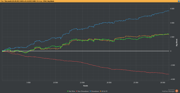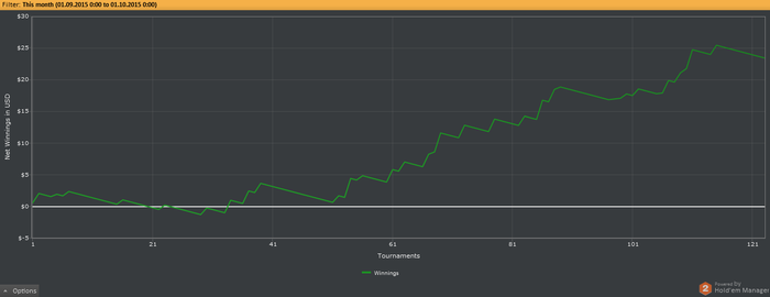 Результатом вполне доволен, но не доволен количеством отыгранных турниров, буду стараться играть больше. Сейчас перешел к цели №2, решил немного отбиться от плана и вместо $0.5/45max turbo играю снг с обычной структурой за $1/45max, $1/180max и $1.5/90max knockout. Буду играть их до отметки БР в $200, думаю что подъем в них будет менее дисперсионным. БР на данный момент 70,29. Надеюсь что октябрь принесет еще больших результатов.
