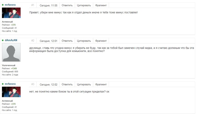 Спустя некоторое время парень как увидел минус подумал что стоит вернуть, разблочил брата в вк и отписал ему. типо так и так я зуладул как смогу так верну.. Теперь этот товарищ требует что бы я убрал минус, ибо он вернул. Но почему то мое мнения о нем осталось прежним, и теперь он мне угрожает))