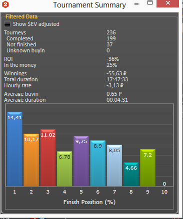 Сегодня выходной, решил сыграть много турниров. В общем сыграл... 47 турниров, в кассе 0,24$. Недельку передохну потом продолжу. Я хер сдамся. Всего 205 турниров.