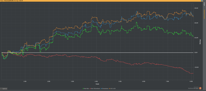 Винрейт конечно оставляет желать лучшего Если бы не переигрывал свои ТПТК против пассивных фишей, думаю было бы намного больше. Буду исправлять офк, вообще даже сейчас более тайтовее стал играть. Не изолирую ООP с карманом 77 и так же перестал коллировать широкие 3беты опов (6+) Посмотрим что выйдет через 40 к рук.