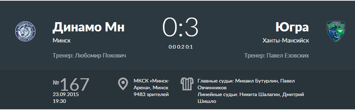 «Динамо» Минск – «Югра» – 0:3 Еще один герой дня из числа вратарей - Владислав Фокин, во второй раз в сезоне оставивший ворота в неприкосновенности. 0:1 – Медведев – 21:53 0:2 – Гусев (Панов, Желдаков) – 34:51 (бол.) 0:3 – Бортников (Панов) – 48:04 Вратари: Гласс – Фокин Броски: 36 (8-14-14) – 21 (10-7-4) Штраф: 4– 8