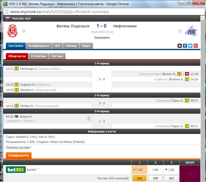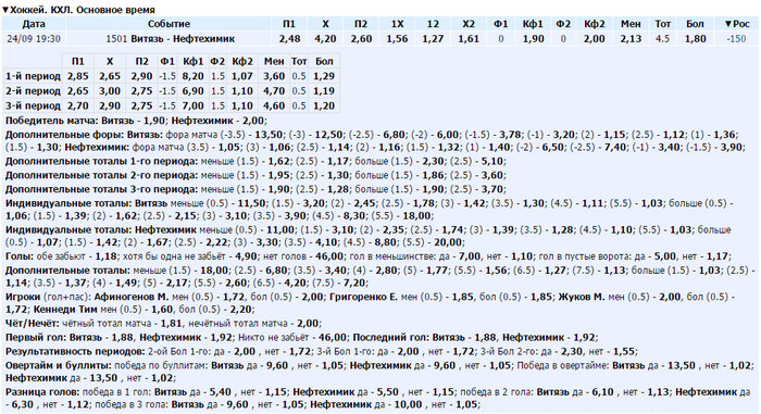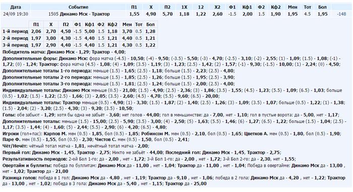 Сегодня в лиге запланировано 2 матча. БК "Зенит" 24.09.2015 Витязь - Нефтехимик - Ничья в основное время (4,2) Динамо Мск - Трактор - Победа Московского Динамо с разницей в 2 шайбы (4,2) Общий коэффициент - 17,64, ставка 100р.