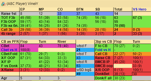 Итак, гляда в этот поп-ап на этого конкретного оппа, могу сказать, что играет он весьма прямолинейно, буду часто блеф-3-бетить его (пока не замечу что фолд на 3-бет против меня начал подозрительно уменьшаться по сравнению с общим 3-бетом), в случае колла 3-бета буду обязательно грузить, если не попаду во флоп. Если хорошо попаду, то буду играть через чек, в надежде на агрессию. С велью диапазоном буду коллить его опен-рейзы, если промажу по флопу - буду чек-рейзить в блеф по флопу или флоатить, в случае попадания во флоп - играть донкбетом или чек/коллом и т.д.