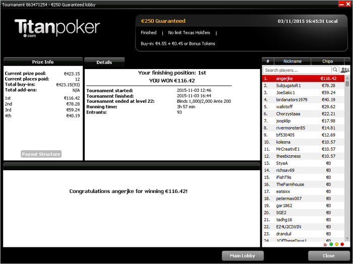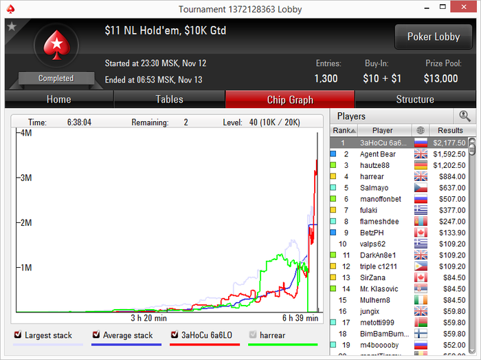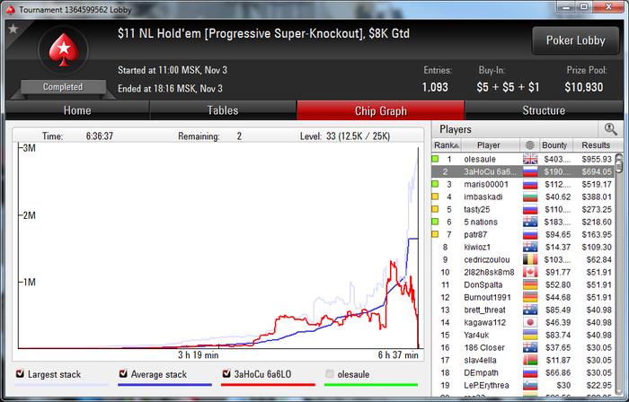 Что ж, самое время подвести покерные итоги уходящего года. Год выдался поворотным - я ушел с работы и теперь зарабатываю только покером. С конца августа пошел в школу 2CC, чем очень доволен. За последние два месяца не было каких-то успехов, так, спокойная будничная катка. Было много недоездов, самый обидный - 9ое место в воскресном биггере за 8. Теперь спокойно откатываю 500+ турниров за месяц, хотя раньше думал, что это ну очень много