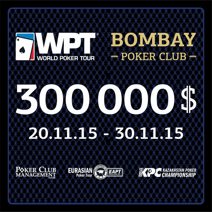 Даты проведения: 20 - 30 ноября 2015 года Место проведения: Казахстан, г. Капшагай, Poker Club Bombay Casino Организаторы: Bombay Casino и Poker Club Management Гарантия свыше 300 000$ С 20 по 30 ноября 2015 года состоится совместный тур PartyPoker World Poker Tour National и Eurasian Poker Tour с гарантией свыше трехсот тысяч долларов. Серию принимает Bombay Casino.