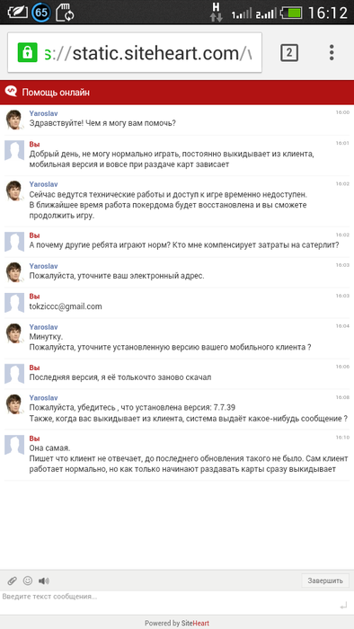 PokerDomConsult, ответ письмом пришел 27.10.2015 в 20:48 О баге сообщил 2-4 часами раньше в чате на странице Покердома, вроде бы - Ярославу Логи переписки сохранил и отправил на почту, которой особо не пользуюсь, т е пароль не смог сейчас вспомнить, но если это очень важно, могу вечером дома востановить и скинуть сюда... Сейчас с телефона пишу...