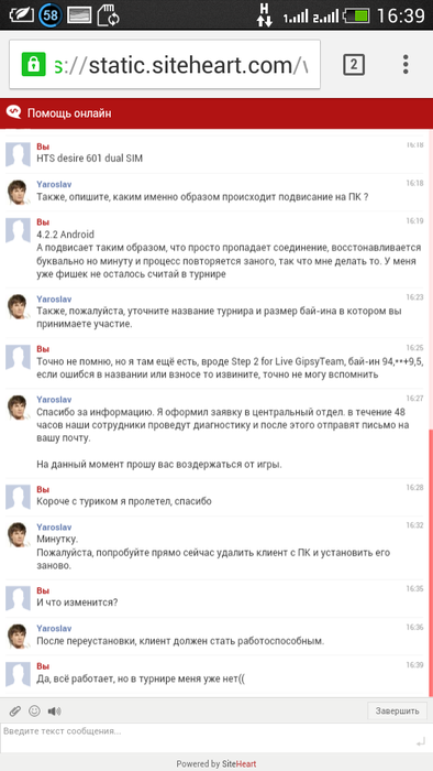 Играю вчера на всеми "любимом" руме PokerDom сталкнулся с проблемой: зарегистрировался в сателлите за 104 рубля в надежде что хоть раз смогу поиграть там (обычно не набиралось минимальное количество участников) и о чудо, мы смогли пройти непреодолимый рубеж в 6 человек. Сразу в начале тернира мне удалось удвоиться и я поверил в себя, что могу отобраться на следующий уровень, подрастеряв немного стека клиент выдал мне ошибку соединения, реконект и опять ошибка. через браузер играть все попытки увенчались прахом, браузер не мог загрузить флэш версию клиента, ну ничего, у меня же есть клиент на телефоне, открываю его, обновление, захожу в лобби, сажусь в свой турнир и вижу такую картину: как только мне начинают раздавать карты клиент тут же зависает и выкидывает меня. Такая ситуация мне очень не понравилась, я тот человек который радуется выигрышу и в 100р., а здесь чип лидер в сателлите за 104!, не было предела моему возмущению, ведь фишки то уходят. Не долго думая я открыл чат в котором произошла следующая переписка: