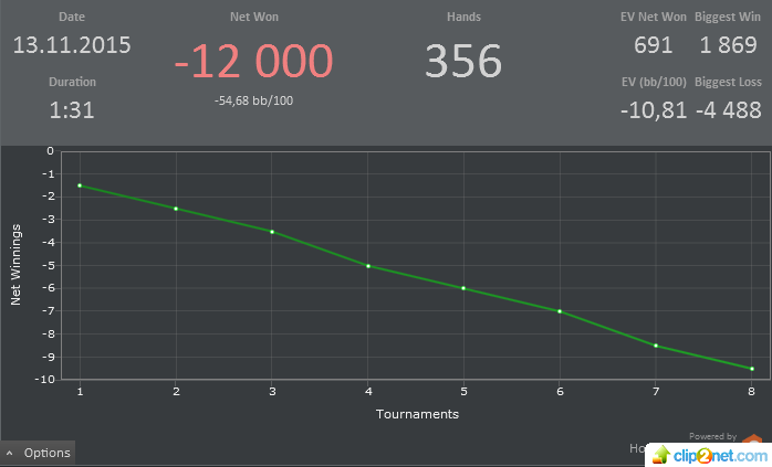 И тааак,начал грузить турниры,грузились слабо,еле набрал 9 столов.Играл плохо(7/10). Играл 4 часа и итог : турниров:11 Профит:16.40$ Перебрал в ББ,в фишках недобрал Как люди наигрывают такое количество турниров,турнир длится 3 часа,времени у меня макс 5,2 часа загрузка