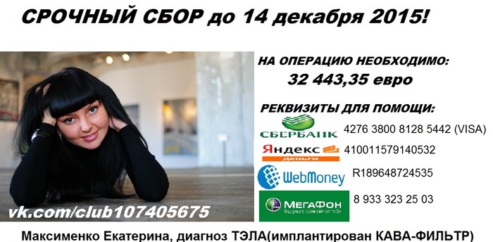 4) МЕГАФОН +7 (933) 323 25 03 ( этот номер только для внесения платежей на данную сим-карту, не для звонков, не привязан к банковской карте) Перевести помощь можно через любой терминал для оплаты мобильных телефонов (просто пополняете счет, как делаете для своего мобильного). Способы пополнения, не выходя из дома: а) Eсли вы клиент "Мегафон", то для помощи Кате просто наберите: *133*300*9333232503# и кнопку вызова где 300 - сумма перевода (переводить можно минимум 1 руб. - максимум 500 руб.). б) Для переводов через интернет: https://www.mobi-money.ru/order/meghttp://spb.megafon.ru/pay/online_payment_credit_card/ (для абонентов "Мегафон") https://pay.mts.ru/webportal/payments (для абонентов "МТС") https://market.tele2.ru (для абонентов "Теле2") http://spb.beeline.ru/customers/how-to-pay/popolnenie.. (для абонентов "Билайн") 8 лет назад в жизнь Кати пришла беда. Девушка стала задыхаться, у нее сильно немела одна нога. Некоторое время доктора недоумевали в поисках диагноза, а Катя находилась в промежуточном состоянии: где-то между жизнью и смертью. Спасибо небу, тогда Катю удалось спасти. В результате долгого и мучительного обследования выяснилось: оторвалось два тромба! По счастливой случайности ни один из них не стал смертельным. 5) Скрил:bes132003@list.ru Для спасения дочери и реабилитации, мама Кати была вынуждена продать квартиру и поднять ее на ноги. 1 февраля 2008 года, во время операции, клинически был установлен диагноз: ТЭЛА (Тромбоэмболия легочной артерии), имплантирован КАВА-ФИЛЬТР в вену. Подробнее о заболевании можно прочесть здесь http://medbe.ru/materials/zabolevaniya-serdtsa-i-sosu... Чудесное спасение стало началом долгой и мучительной реабилитации длиною в 5 лет. Сначала девушка училась заново дышать, затем ходить, после жить нормальной жизнью. Кате удалось преодолеть себя, страхи и физические возможности, снова начать не только работать, но даже петь(!) и заниматься спортом(!!!), что после полного отказа легкого и ноги кажется нереальным. Более того, каждые пол года, проходя терапию, получая через капельницы ряд медикаментов, которые Катин организм принимал плохо, с побочными эффектами, девушка скрывала от окружающих свои проблемы со здоровьем, оберегая друзей и коллег от волнений и переживаний. Казалось, все наладилось, и вот теперь жизнь начинается с чистого листа. Катя переехала жить в Москву, активно работала, занималась общественной деятельностью, пропагандируя занятия спортом и здоровый образ жизни в рамках известных проектов Onfit.ru, Гонка Героев, команда «Звездный десант». Несколько месяцев назад состояние здоровья девушки значительно ухудшилось: головокружения вплоть до потери сознания, тошнота, слабость, затрудненное дыхание, увеличение давления и температуры. Катя обратилась к Российским специалистам, которые проверили обследования КТ от 11.11.2015 г. и составили заключение: в НПВ отличается миграция одного из лучей фильтра в толщину подвоздушной полости, экстравазация лучей кава-фильтра выходят за пределы НПВ. Так же стало известно, что в мире уже десятилетия не ставят фильтры того поколения, который установлен у Кати. Проведенных операций по удалению этого фильтра в МИРЕ(!) – единицы. Доктора, практикующие в России пока только говорят о возможности решения этого вопроса. Проведенных операций с данной моделью и опытом минимальны. В связи со смещением КАВА-ФИЛЬТРА через него затруднено прохождение крови, особенно более густой чем у обычного человека. Катя вынуждена еже