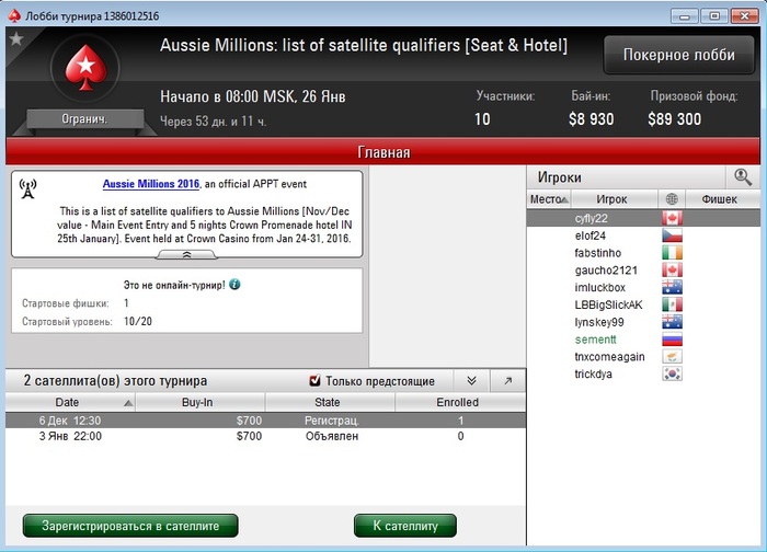 Вы сможете зарегистрироваться в любой первый день турнира на месте, начиная с 22 января 2016 в отделе регистраций "Crown Melbourne Poker Tournament Registration Booth".