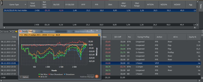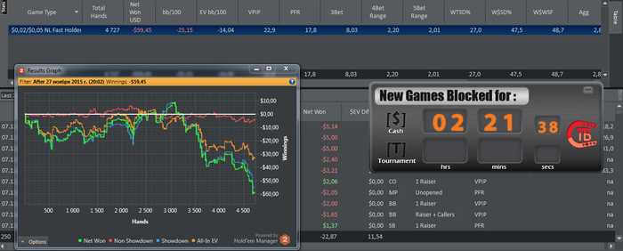 День 5 БР 143$ В конце дня получил серию пиздюлей, в пике БР был 180+, забаррелил два раза оверпару в сет в 3бет потах, серия не удачных блеф 4бетов, и начек-коллил в топ диапозоны