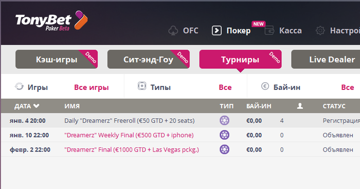 Вне всяких сомнений, это ЛУЧШИЙ способ получить свой билет «все включено» в Лас Вегас СОВЕРШЕННО БЕСПЛАТНО! Расписание турниров можно найти здесь (https://ru.tonybetpoker.com/poker_promotions/10-000-dreamerz-freeroll-league).