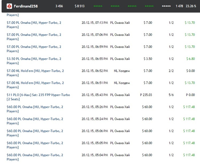 Решил спокойно подождать, ибо был уверен в положительном результате дела. Но тут 22 декабря мне присылают письмо такого содержания. . Я был шокирован, честно говоря. Добрые люди подсказали посмотреть историю турниров и... оказывается, 20 декабря я катал серию гипертурбо ХА турниров по Омахе Хай на лимитах в 3,5-7-30$. (напомню,что я обычный посредственный регуляр кеша холдема НЛ10 SH). Причём проиграны эти ХА турниры были одному и тому же игроку с ником river_kvin(тоже забанен). Посмотрел историю турниров этого "человека", последний раз он играл до этого дня аж в 2012 году также ХА турниры.