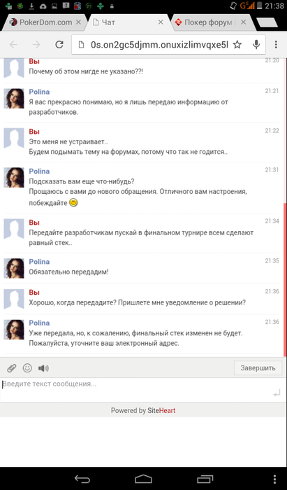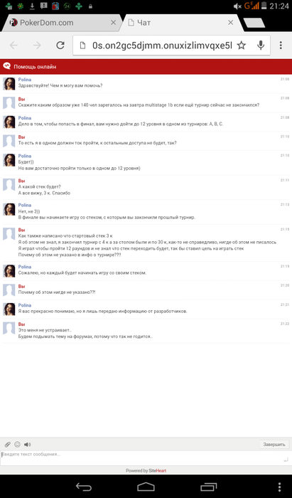 Всем привет. Сегодня на покердом прошёл фрирол Multistage Day 1A Gold Freeroll 150K GTD. В инфо турнира указано что каждый выживший игрок будет зарегистрирован в вышестоящий турнир. Вот он окончился, по итогам 12 раундов я окончил турнир со стеком 4к, так как цель была поставлена выжить 12 раундов. Написав в поддержку, так как не понятно было на счёт завтрашнего 1B аналогичного турнира, я узнаю что в финальном турнире стеки будут те с которыми мы окончили турниры. Хотя об этом нигде не было указано и в финальном турнире в информации указано стартовый стек 3к. Ниже прикрепляются переписку с тех поддержкой. В диалоге после моего вопроса почему нигде об этом не указано, мне Polina ответила: "Я вам об этом говорю))" потом сразу удалила и написала следующее. Как-то разочоровали немного((