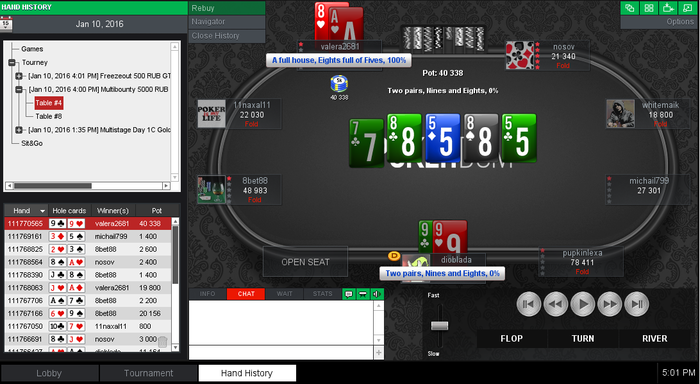 Удачи в марафоне. Не раз замечал, что на флопе с 8 и 2 мелкими если а8 пихает то именно против 99 приходит еще 1 8ка
