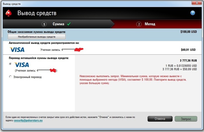Если не пройдет такой вариант, то ставь на вывод точно $49.91 - эта сумма уйдет. Ну, а остальное наигрывай до $100.