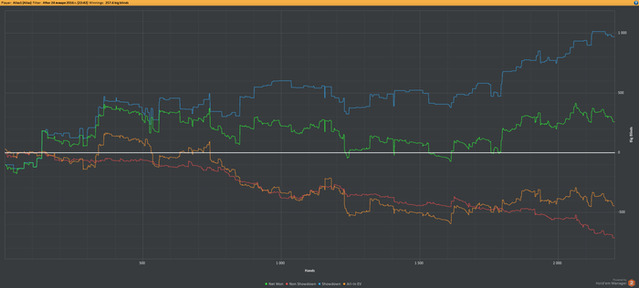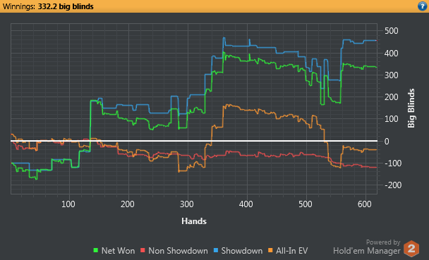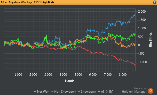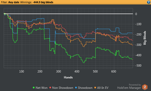 Дальше по жизненным обстоятельствам играть стал всё меньше и меньше, а когда собрался снова, то выяснилось, что прежние навыки не годятся. Скатился до PLO10, где сейчас и веду околонулевое с трендом в минус существование. Ниже уже скучно, выше, с учетом тренда, пока бессмысленно.