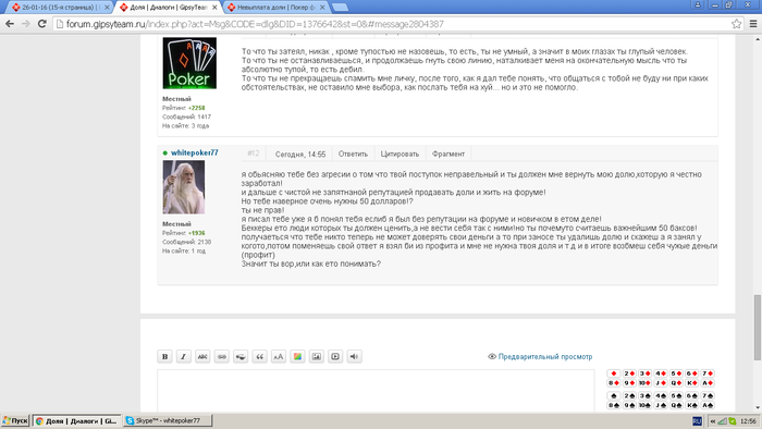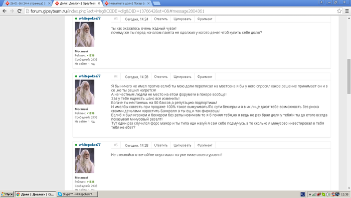"Я зарегистрировался без тебя, до тебя, и до мостсена, это были деньги с итм биг 8.80, он переслал деньги намного позже, а о тебе вообще молчу. И ты о какой-то свой доле честно заработанной говоришь, а главное не преминул меня говном полить, что я за 50$ иудой стал.