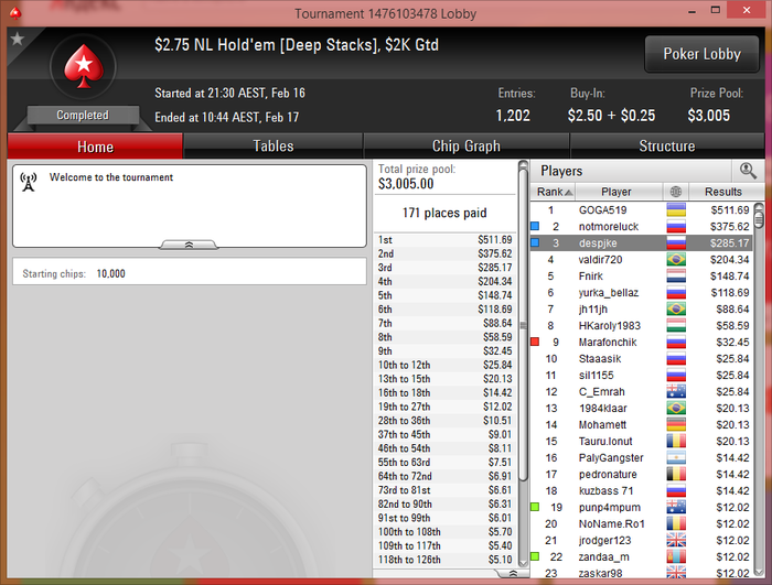 Poker Stars $2.00+$2.00+$0.40 No Limit Hold'em Tournament - t50/t100 Blinds + t10 - 9 players -