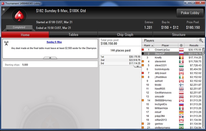 Poker Stars $500+$30 No Limit Hold'em Tournament - t1250/t2500 Blinds + t250 - 8 players