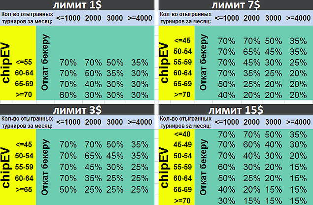 1) chipEV и кол-во турниров мы смотрим в конце месяца и в зависимости от них определяем откат по таблице. Дистанцию и chipEV всегда округляем до ближайшего меньшего значения.