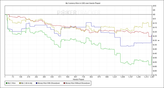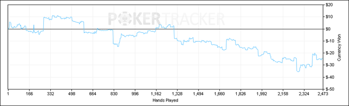 Как бы это сказать – меня накрыло ребят. День начался с того что я проиграл КК в 5bet банке против А6s причем running twice. Доходило даже до того что в 3bет банке с натсовым стритом плюс натсовим флеш дро, running twice, я умудрился один раз проиграть, оппонент поймал Фулл Хаус по риверу, как результат вот такой график. Решил продолжить играть уже завтра, хочется отдохнуть немного и понять причины не везения.