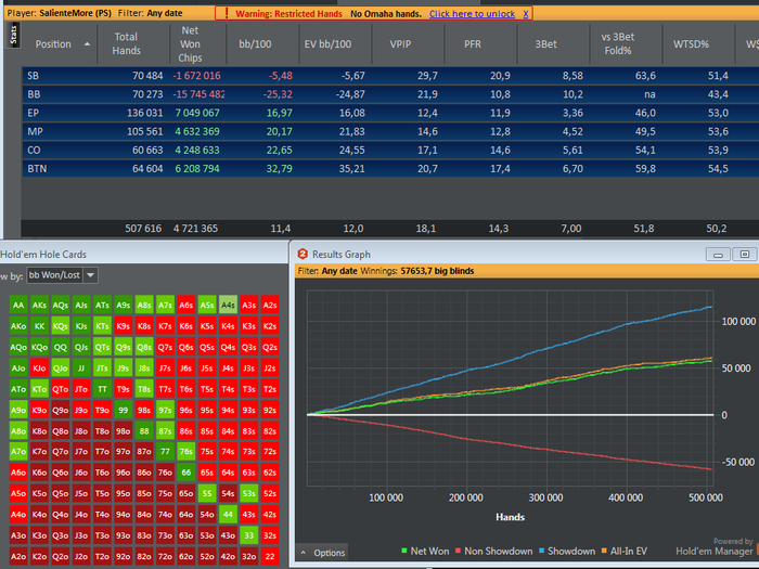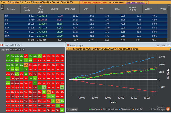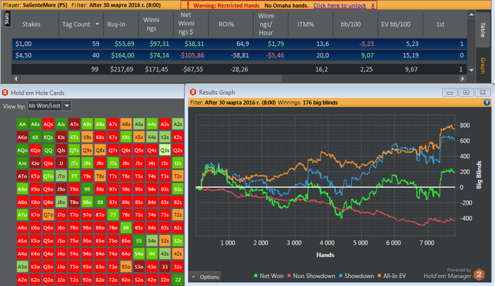 Пора отчетик оформить. С момента создания блога откатал 3 сессии на стриме. Результат , к сожалению , не радует . -Упал впип\пфр ; 3бет ; деф ББ и сБ ;Кбетсы Конечно выборка никакая (4.5к рук) ,Но все же. Еще Не привык столько трындеть на стриме(теряю концентрацию) + вебка отвелекает. Хочется покрасоваться все время ,сделать страшное лицо и т.п От стримов конечно не откажусь- есть в этом занятии что-то такое ,что покрывает все минуса .