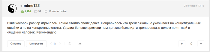 Провели тренировку в режиме лайф-сессии с тренером. Показал некоторые интересные линии, нашел недочеты, выработал план их решения. В общем для микролимитов самое Ок. Для первого занятия оценка 5/5.