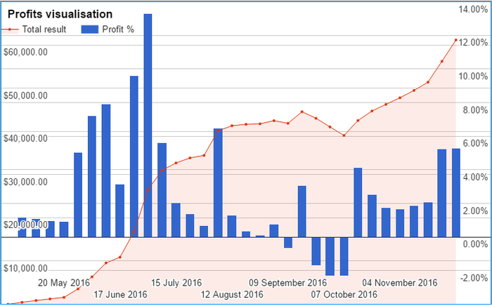 Прибыль делится в пропорции 50 на 50. Мы можем рассчитывать на общую прибыль 1-2% в неделю на неактивном рынке и 2-5% при сильных движениях курса в любую сторону.