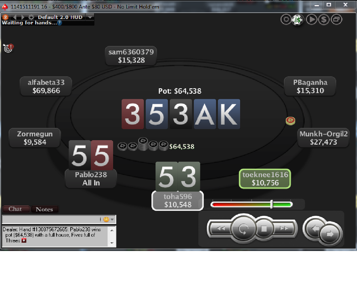Открываю x8 префлоп один колит, по флопу алл-ин в размере его стека, он колит. Удивляет, что весь стол сделал фолд, и именно он сделал колл, как будто знал что выиграет, кого в скайпе не спрошу все хором говорят никто не поставил бы 31% своего банкролла с 76o.