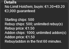 Знакомая структура) Кстати да, мой вопрос даже скорее применительно к этому турниру был - все-таки этот куда чаще проходит. Да и особо разницы между ними не вижу - тут тоже по логике нужно минимально инвестировать в ребаи, но доживать до адд-онов любой ценой. Но вопрос сколько делать этих адд-онов остается открытым..