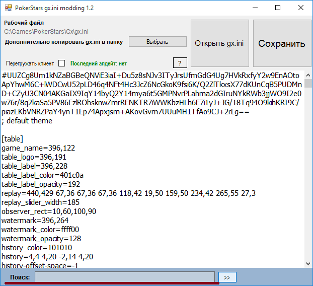 1. Качаем программу PokerStars Modder 1.2 2. Открываем архив (для этого подойдёт бесплатная программа WinRAR) и запускаем PokerStars Modding gx.ini.exe. Откроется вот такое окно.
