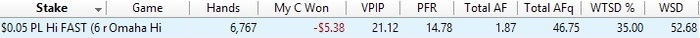PokerStars - $0.05 PL Hi FAST (6 max) - Omaha Hi - 6 playersHand converted by PokerTracker 4BTN: 271 BB (VPIP: 32.32, PFR: 24.24, 3Bet Preflop: 8.11, Hands: 102)