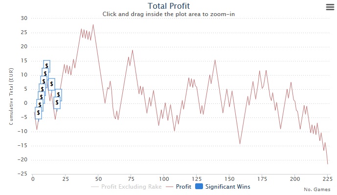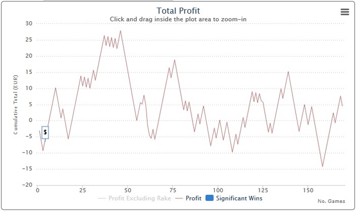 Игра не идет ни капельки, график показывает проебищную тенденцию. Твердо решил для себя - ухожу за день в -10,5$ - откладываю игру на следующий день. Понимаю, что некоторые сессии закончатся так и не успев начаться но лучше так, чем как есть сейчас. Не могу сказать, что меня безбожно переезжают, просто после двух-трех проигрышей появляется дикое желание выебать оппа побыстрее.